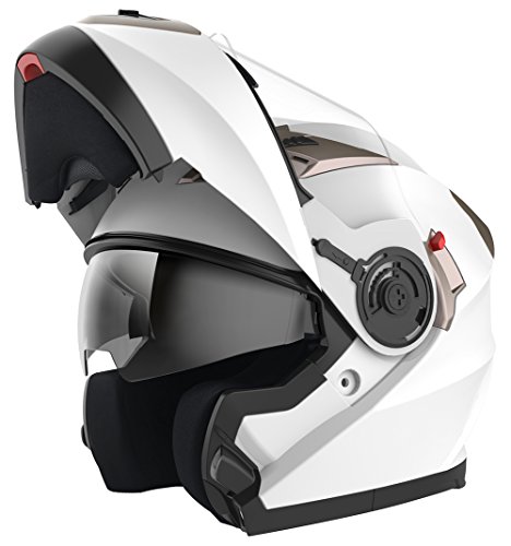 Este casco modular resguarda la cabeza íntegramente de manera segura, e incluye un sistema de doble visera desplegable, ideal para proteger tu visión mientras conduces por la carretera. Además, cuenta con un bonito diseño aerodinámico en color blanco, adecuado para hombres y mujeres.
