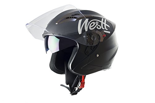 Es un casco con un diseño avanzado de los cascos clásicos modelos jet, de color negro mate y doble visor, que cuenta con el certificado europeo de seguridad.