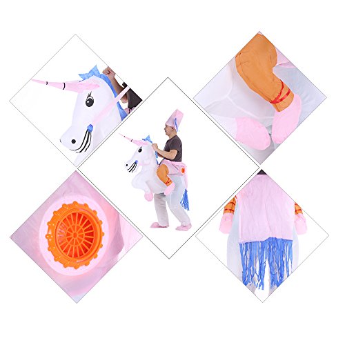 Es un modelo de disfraz que cuenta con una parte inflable en forma de un atractivo unicornio, lo que le añade al atuendo un toque divertido. Dispone de una bomba de aire que funciona con baterías, que puedes llevar cómodamente en tu bolsillo.