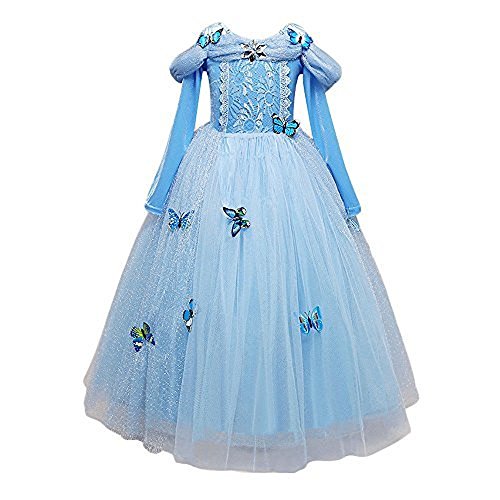 Se trata de un elegante y atractivo vestido que evoca a Cinderella, la hermosa princesa de Disney del cuento de La Cenicienta. El vestido viene en color azul con diferentes tonos, está bellamente decorado con encajes y varias mariposas de llamativos colores que se sujetan a la tela con imperdibles.