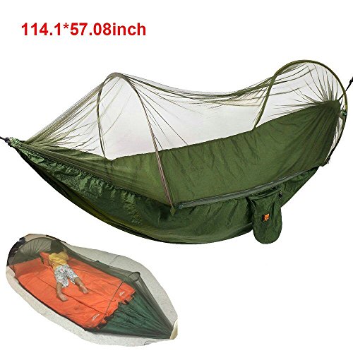 Para facilitar el transporte, dispone de una bolsa de almacenamiento que reduce su tamaño a unas dimensiones de 30 x 28 centímetros. Asimismo, está dotada con una mosquitera en malla, para aislar a los insectos. Gracias a esta propiedad, la hamaca tiene una doble función, ya que también se puede convertir en tienda de campaña.