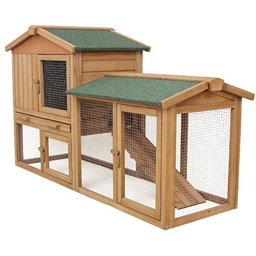 Esta jaula en forma de casita está fabricada en madera de abeto, sólida, atractiva y robusta, y cuenta con dos módulos a dos niveles al que el conejo podrá acceder a través de una cómoda rampa, Estos están cubiertos con un techo hidrófugo de capas asfálticas gracias a las cuales tu mascota estará bien protegida de la lluvia.