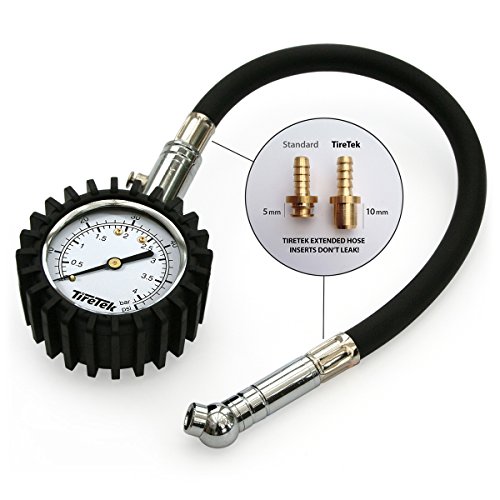 Para quienes están en la búsqueda del mejor manómetro del mercado, sería conveniente que puedan conocer las propiedades de este modelo comercializado por TireTek, que resalta por su alto grado de precisión. Este modelo es de estilo analógico y es capaz de medir hasta cuatro bares de presión, siendo una opción adecuada para neumáticos de coche o moto.