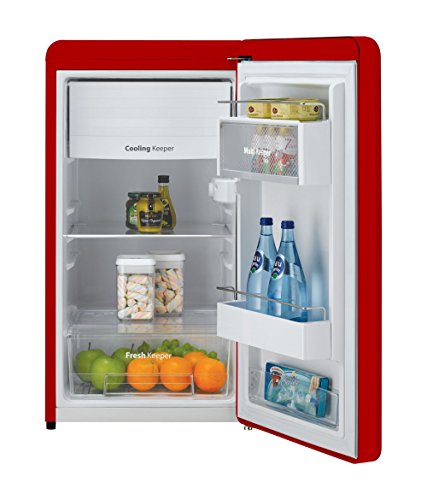El diseño de esta nevera es estilo retro inspirado en los frigoríficos de la década de los 50’, tal como indica su fabricante. Es sencillo, atractivo e incluso elegante y está disponible en dos colores diferentes: negro y rojo.