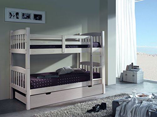 La litera de tres camas que te ofrece la marca Mueblesya.com puede ser el complemento adecuado para un cuarto juvenil y moderno. La estructura de la litera está compuesta por un 100% de pino macizo de color blanco pero que cuenta con un tratamiento de decapado lavado que le da un color más natural y suave a la vez.