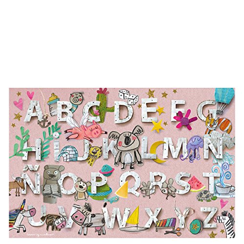 Se trata del Laroom 14274, elaborado con vinilo antiliscante de 0,3 centímetros y con un estampado que combina las letras del abecedario en tono blanco, con algunos dibujos en trazos libres de un koala, una vaca, un cerdo, un cactus, entre otros. Es importante comentar que dicha superficie incorpora un tratamiento antialérgico y un agradable tacto suave.