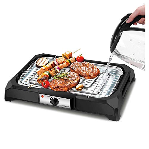 Este tamaño no implica una menor potencia, dado que la misma llega a los 2.000 vatios. Además, esta parrilla incluye el sistema de bandeja inferior con agua, que retiene las grasas y evita los humos habituales en las barbacoas convencionales. Otra ventaja de esa agua es que, si le añades algunas hierbas o especias, también les darás un agradable aroma a tus alimentos.