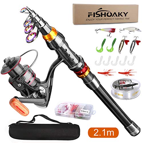 El kit de pesca de FISHOAKY, de 2,1 metros de largo, es un producto completo y pensado para la pesca en río o mar. Un kit de caña y carrete que dispone de una línea de pesca de unos 100 metros de largo, siendo más que suficiente para moverse en estos terrenos. Esta línea se monta sobre un carril de engranajes con una relación 5.2:1, lo que facilita el movimiento del sedal y la recogida del hilo.