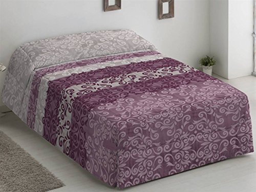 Nos encontramos ante una colcha que, estéticamente, combina varios tonos de gris y morado junto a un estampado de florituras muy bonito; adecuado para todo tipo de habitaciones. Mide 250 x 270 centímetros y en conjunto con el tejido, tiene un relleno de 400 gr/m², siendo calentito para el invierno.