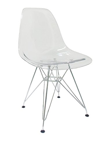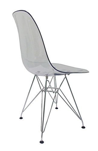 Esta silla es un modelo inspirado en el diseño original de la Silla DSR, mundialmente conocido como el ícono del estilo industrial, que fue creado por el matrimonio Charles y Ray Eames. Está fabricada en plástico de policarbonato transparente y metal, por lo que es capaz de soportar un peso de hasta 120 kilogramos.