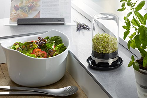 Diseño: El modelo con base de silicona y acero inoxidable posee una cúpula de vidrio, que proporciona un funcionamiento tipo mini invernadero, que ofrece condiciones óptimas para el rápido brote de las semillas.