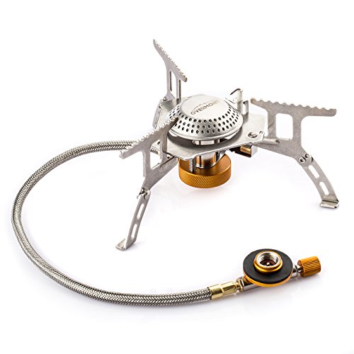 El kit de cocina al aire libre de Overmont DS201 es un modelo diferente, adecuado para cocinar todo tipo de platos como en casa. En este caso, hablamos de un hornillo de gas portátil, fabricado en aluminio de alta dureza y resistencia, que cuenta con un soporte propio con un bajo centro de gravedad y alimentación mediante cartuchos.