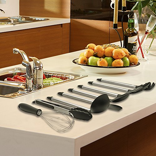 Gracias a sus cualidades versátiles, cada utensilio pueden ser utilizado en diferentes tareas, y el soporte favorece el ahorro de espacio, al tiempo que facilita tener a mano y organizadas todas las piezas. Este modelo de juego de cocina está fabricado con un mango indeformable de acero inoxidable y un cabezal en material plástico resistente al calor e ideal para cuidar el revestimiento de tus ollas.