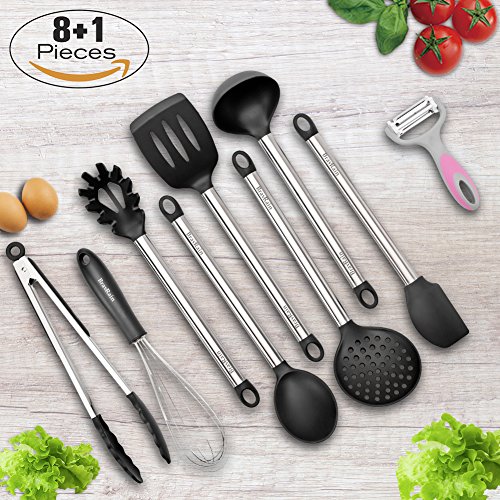 Si quieres conservar libre de ralladuras y en óptimo estado el tratamiento antiadherente de tus ollas, sartenes y cazos, lo mejor es hacerte con un juego de utensilios de alta calidad. Estos juegos de cocina vienen en sets de varias piezas que te facilitan la vida, ya que pueden cubrir prácticamente todas las necesidades a la hora de cocinar, como remover, batir, preparar recetas, así como también para ayudar a servir los alimentos directamente a la mesa. Por su gran utilidad y uso intensivo, debes buscar un modelo que te ofrezca materiales resistentes al calor y a la deformación. En este sentido, te ofrecemos el Enko 10 piezas, un producto que te ofrece 10 utensilios, fabricados totalmente en silicona de alta calidad que cuidan tu batería de cocina. Otro modelo con alta puntuación e igualmente recomendado, es el BravRain Acero inoxidable que te ofrece 9 piezas, diseñadas en acero inoxidable y silicona.