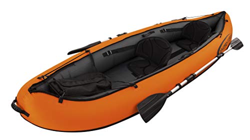 Los materiales altamente resistentes de este kayak garantizan la durabilidad de éste, con una capacidad para dos personas ya que tiene una resistencia máxima de 160 kg. Los dos asientos son ajustables y también inflables, e incluyen respaldo para mayor comodidad de los navegantes. Los dos remos de aluminio son livianos pero resistentes y miden 219 cm cada uno.