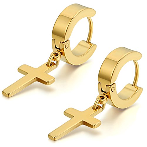 Estos son pendientes con forma de aro y colgante de cruz, que viene en tres presentaciones: dorado, negro y plata, muy llamativos y con un aspecto casual y elegante, que pueden ser usados incluso por hombres.