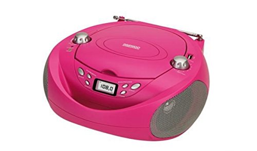 Este producto ostenta la marca comercial más conocida en esta comparativa y el color más llamativo de todos: rosa pleno sin ninguna otra gama cromática que le haga competencia visual, salvo el logotipo blanco en la tapa del porta-CD y los mandos (y rejillas de los altavoces) plateados.