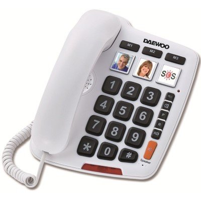Es un teléfono fijo para personas mayores, práctico, funcional y de bajo peso, con un gran tamaño y una capacidad de memoria para llamada directa de seis contactos.