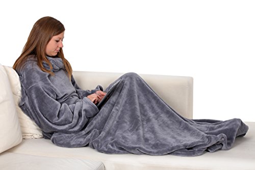 El tejido de elaboración de la manta tiene un acabado suave que la hace muy agradable al tacto. Cuenta con mangas para tapar los brazos y también bolsillos donde podrás guardar cualquier objeto que desees y es posible lavarla en máquina.