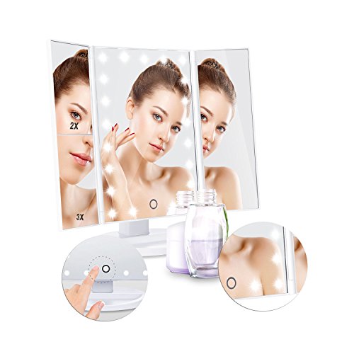 El espejo puede ser un instrumento muy útil para facilitar la aplicación de maquillaje, además de ser plegable por si deseas llevarlo en tu maleta cuando vayas de viaje. Está equipado con iluminación y cuenta con un botón táctil para encender y apagar.