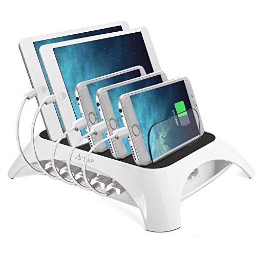 Si tienes que cargar todo tipo de equipos a la vez, disponer de una base de carga con diferentes conectores es una solución inteligente. A esta categoría pertenece el modelo ACTOPP PWS0012, que nos ofrece hasta cinco conectores diferentes, con cinco espacios separados donde cargar móviles, tabletas y otros dispositivos.