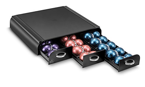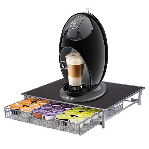 Está dotado con una base antideslizante para evitar arañazos sobre la superficie. Sus dimensiones varían de acuerdo al cajón. Sin embargo, es adecuado para posicionar la máquina sobre él y ahorrar espacio, siendo apropiado para el hogar u oficina. Tiene capacidad para 42 monodosis de Dolce Gusto, 42 unidades de Verismo o 48 de Nespresso tradicional.