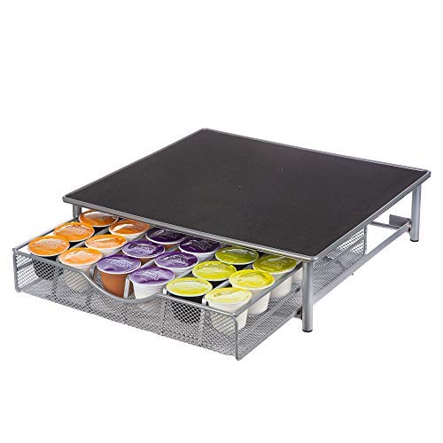 Es un elegante organizador de cápsulas de café construido en acero inoxidable de buena calidad y ofrece un soporte para la cafetera, lo que permite proteger la encimera contra derrames y daños ocasionados por la vibración, siendo un producto práctico y resistente.