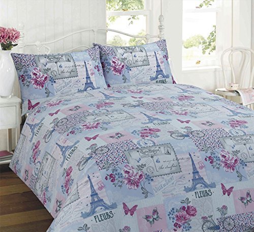 Se trata de un set de ropa de cama con inspiración francesa y diseñado con textiles donde predominan las imágenes de la emblemática torre Eiffel, así como también flores, mariposas y otros bellos motivos. Sus colores más destacados son el lila, el rosa, el gris y el azul verdoso, los que conforman una pieza de gran belleza y elegancia que no solo viste tu cama, sino que también te brinda confort y abrigo en las noches.