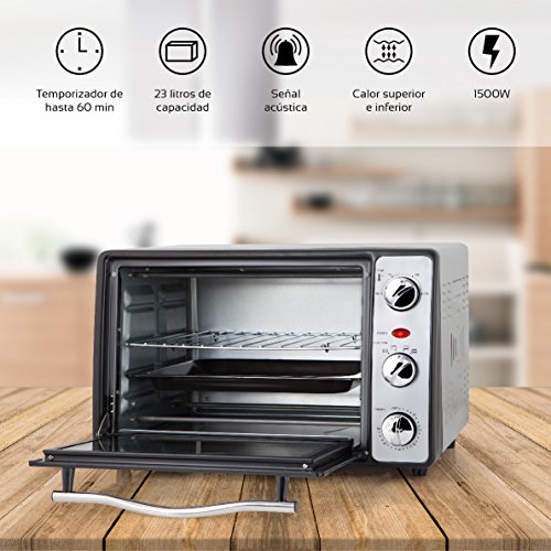 Es un horno pequeño pero cómodo de utilizar. Tiene una buena potencia y un regulador de intensidad de calor que te ayudará a preparar todo tipo de recetas. Su fabricación es robusta y tiene buenos acabados, así como también funciones extra muy prácticas.