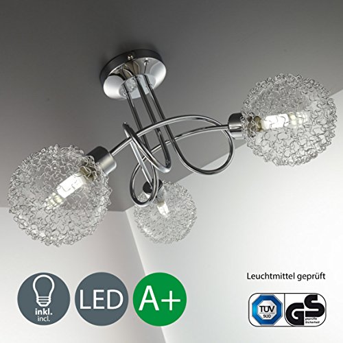 Esta lámpara cromada se monta directamente sobre el techo ofreciendo una estructura elegante y de calidad. Dispone de tres brazos diferentes con bombillas de 3,5 vatios y 320 lúmenes para totalizar 960 lúmenes de iluminación, adecuados para estancias de diferentes tamaños.