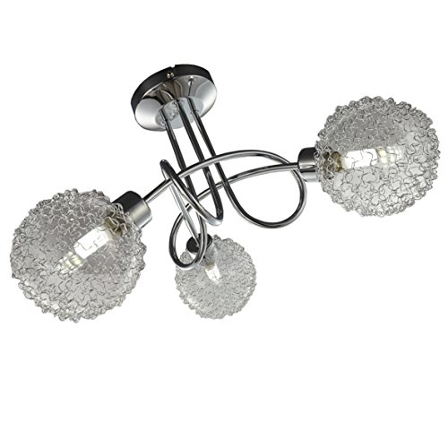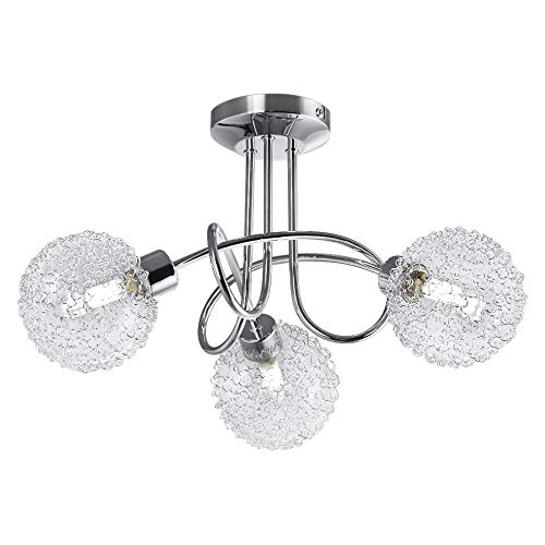 Se trata de una lámpara de techo que cuenta con un moderno diseño cromado y bonitas bolas de cristal, divididas en tres ramas unidas a través de una barra con bonitas líneas curvadas, por lo que puede integrarse cómodamente en cualquier estancia dándole un toque elegante y acogedor a la habitación.