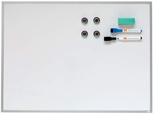 Esta es una pizarra blanca magnética con una superficie de escritura lisa, suave al tacto y muy duradera, con medidas de 60 cm de ancho por 45 cm de alto si se utiliza horizontalmente.