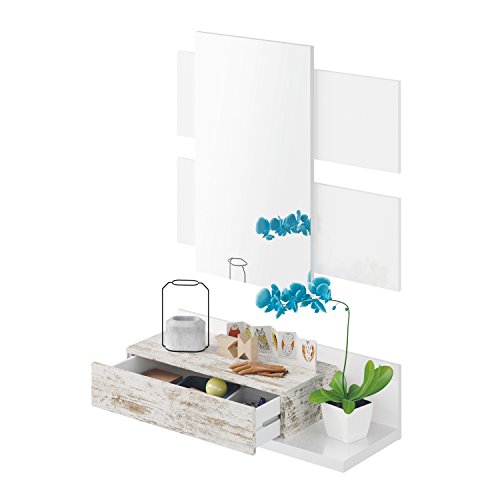Este recibidor vintage colgante se ajusta fácilmente a lugares con poco espacio, es cómodo, práctico para instalar y tiene un diseño sobrio y agradable. Consta de un cajón y un espejo, y viene con accesorios y base de cajón fabricados en melamina, que brindan en general un buen acabado.