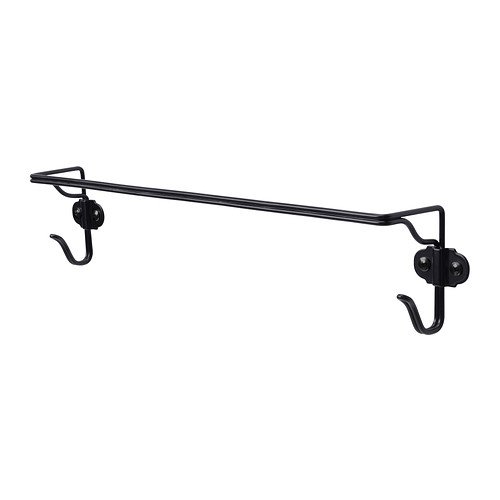 El toallero está compuesto por una sola barra para colgar tu toalla de baño que más uses, también puedes montarlo en tu habitación o cocina, ya que incluye dos perchas que te permitirán colgar desde cepillos de baño u otro tipo de objetos. El producto está elaborado con materiales de acero de buena calidad, además, las perchas pueden ser intercambiables por otros modelos que la serie Svartsjon de Ikea ofrece. Las dimensiones de la barra son 46 centímetros de largo y tiene una profundidad de 6 centímetros.
