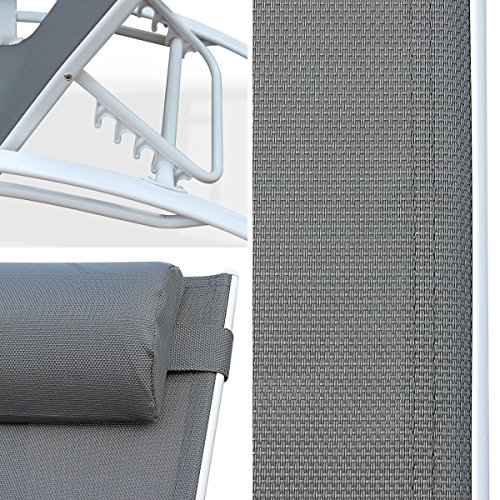 Confort: El respaldo se puede ajustar en 6 posiciones diferentes para mayor comodidad, además incluye un reposacabezas en cada tumbona.