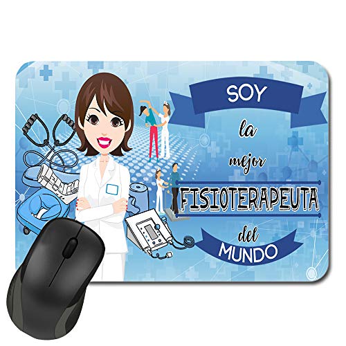 Viene con el eslogan “Soy la mejor fisioterapeuta del mundo” sobre un fondo azul y trae una imagen de colores brillantes de una fisioterapeuta sonriente. La alfombrilla trae esquinas redondeadas y, adicionalmente, es adherente para evitar que se deslice por el movimiento del ratón. El tamaño de la alfombrilla es de 18 x 21,5 cm y viene en una funda para regalo.