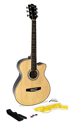 Como mejor guitarra electroacústica de relación calidad precio, es decir, entre las más baratas, encontrarás este modelo, que se caracteriza por tener un atractivo diseño, que es posible encontrar en tres colores, aunque el presente prototipo es de color negro. Tiene una estructura resistente que combina acabados cromados y cuerdas de acero, que producen un mejor sonido y suponen un considerable nivel de robustez.