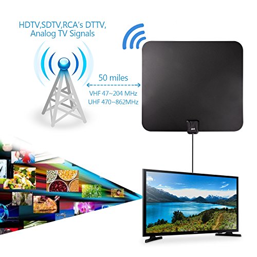 En cuanto a los accesorios incluidos en el paquete, podrás disfrutar de un conversor de TV, un cable amplificador, adhesivos mágicos y, por supuesto, el manual de usuarios donde podrás encontrar claramente descrita la información adecuada para llevar a cabo la conexión de dicha antena. Por otra parte, esta antena tiene un rango de recepción de hasta 50 millas, lo que equivale a 80 kilómetros.